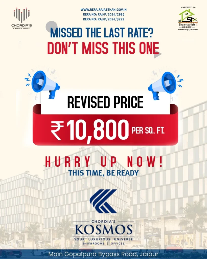 Located in the prime commercial zone of Mansarovar, Jaipur, Kosmos is an iconic business address crafted for ambitious professionals, startups, corporates, and smart investors.